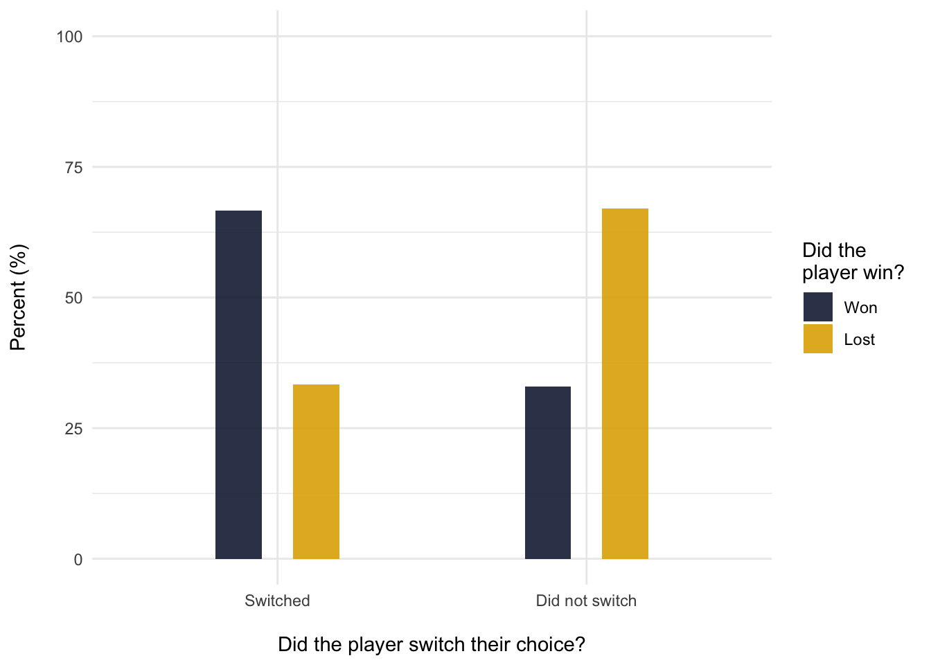 labs(x = "\nDid the player switch their choice?", fill = "Did the \nplayer win? ", y = "Percent (%)\n") +
