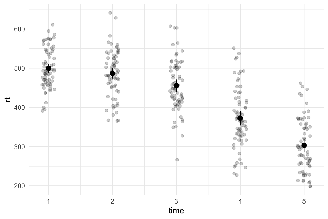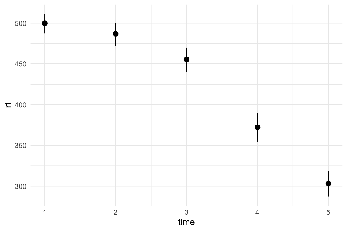 We’ve got the data in a long format - there are 70 individuals, each provides a reaction time measure at five time points. Note that time point is aligned to the right - this means that R is treating it as a numeric variable, and not a factor or a character vector1. That’s fine for this example. If we want to see how the overall reaction times differ at each time point, we could create a simple means plot with bootstrapped confidence intervals: