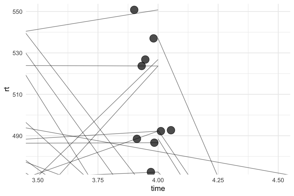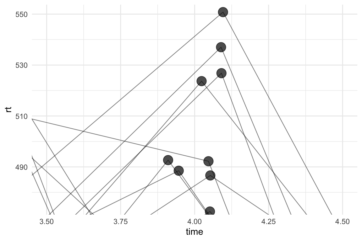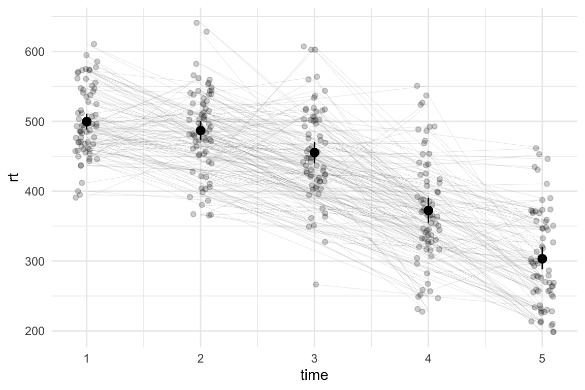 I would normally treat this as a multilevel (or mixed effects) model - where the reaction times for each time point are nested within the participants. In such context, it can be useful to also plot the lines that link the participants’ scores between the time-points. We can do this by adding geom_path() and specifying the grouping variable (in our case, id) in the aesthetics(aes(group = id)):
